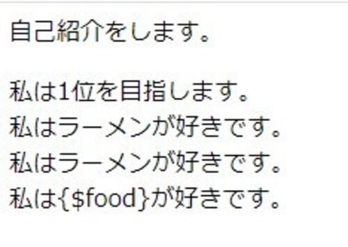 ランキング参加中プログラミング [TOP] 次>> 以下のPHPプログラムをテキストエディタで作成して「phpsample」フォルダに保存して下さい。 【introduce4.php】 <p>自己紹介をします。</p> "); $food = "ラーメン"; print("私は".$food."が好きです。<br>"); print("私は{…